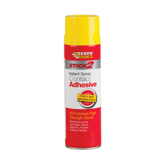 Everbuild Aerosol Spray Contact Adhesive - 500ml. A medium-duty spray contact adhesive which fixes P.U. and foam backed carpets, carpet tiles, underlay, paper felt and cork to most common substrates. Checked and packed by one of our own team so it is right when it arrives