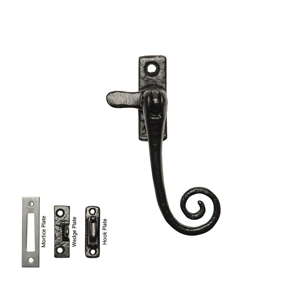 Kirkpatrick Monkeytail Casement Fastener with Hook Plate Antique Black. Traditional style curly tail window fastener manufactured by Kirkpatrick for use on standard casement windows. Constructed in traditional forged style, this curly tail window fastener has a unique handmade finish to it. Available in Antique Black. Ideal for suiting with other Kirkpatrick ironmongery. Matching stay available. Supplied with hook-plate, wedge-plate or mortice-plate keep options. Checked and packed by one of our team so its right when it arrives.