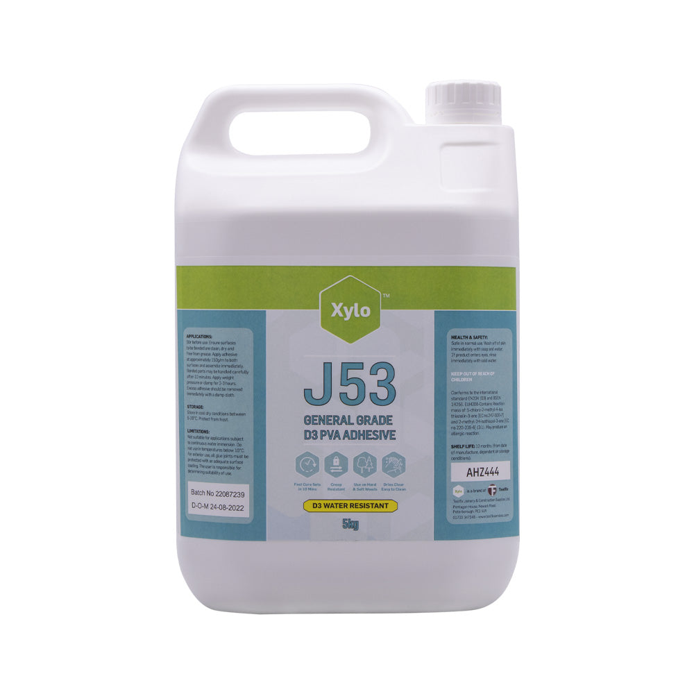 Xylo D3 Standard Grade J53 PVA Woodglue. Xylo J53 is a one part D3 Grade Internal PVA emulsion adhesive, specially formulated for bonding wood providung a high strength, impact resistant bond for all general woodworking applications. Checked and packed by our own team so it's right when it arrives.